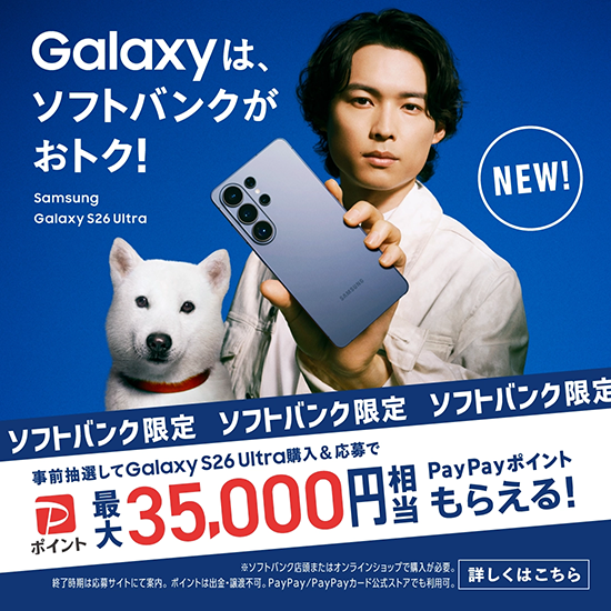 Galaxyは、ソフトバンクがおトク!Samsung Galaxy S26 Ultra NEW! ソフトバンク限定 事前抽選してGalaxy S26 Ultra購入&応募でPayPayポイント最大35,000円相当もらえる!詳しくはこちら