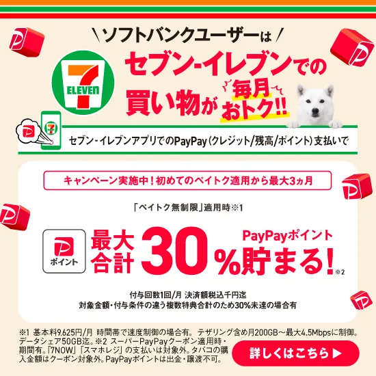 ソフトバンクユーザーセブンイレブンの買い物が毎月おトク!セブンイレブンアプリでのペイペイ支払いで最大合計30%ペイペイポイント貯まる! 詳しくはこちら