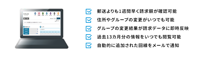 24時間いつでもオンラインで回線グループの変更や請求書の送付先が変更が可能です。