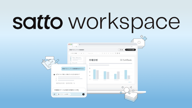 satto workspaceは資料業務に特化した生成AIチャットサービスです。資料の山から探す手間、白紙からのスライド作成、数値や最新情報の反映。資料業務のあらゆる面倒をサッと解決し、あなたとチームの生産性を最大化する新しいAIワークスペース。