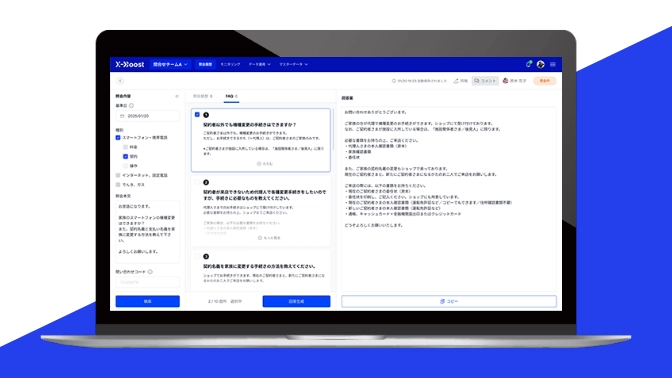 コンタクトセンターなどの照会応答業務をサポートする生成AIオペレーティングSaaSプラットフォームです。バックオフィスとの連携を生成AI にまかせて業務効率化しましょう。