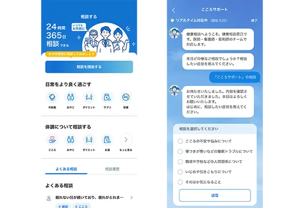 突発的な体調不良の相談はもちろん、慢性的な疾患の改善⽅法や健康時に気になることを相談できるツールとなります。