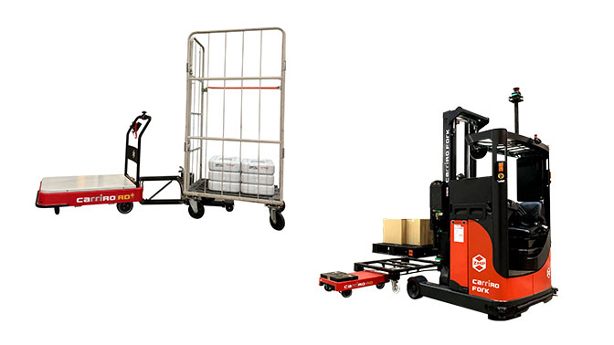追従・自動走行機能を搭載したAGVや無人フォークリフト、無人牽引車との連携で、さまざまな方式で荷物の搬送ができ、荷物の自動搬送による大幅な効率化が可能。