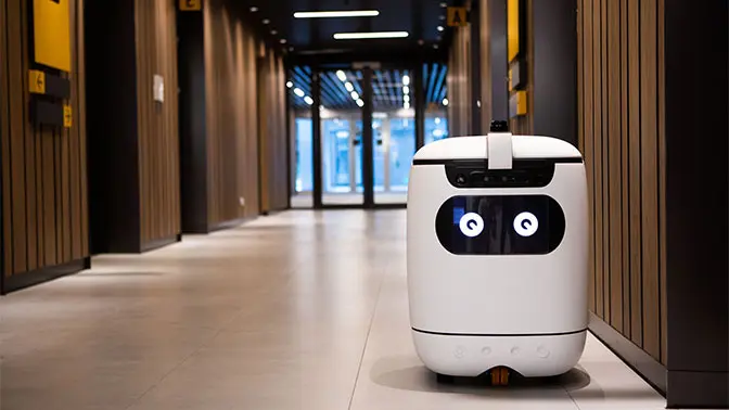 障害物回避機能を持ち、先導や案内も可能な配送ロボット。エレベーター連携など多彩なシステム連携により幅広いユースケースへの適用が可能。