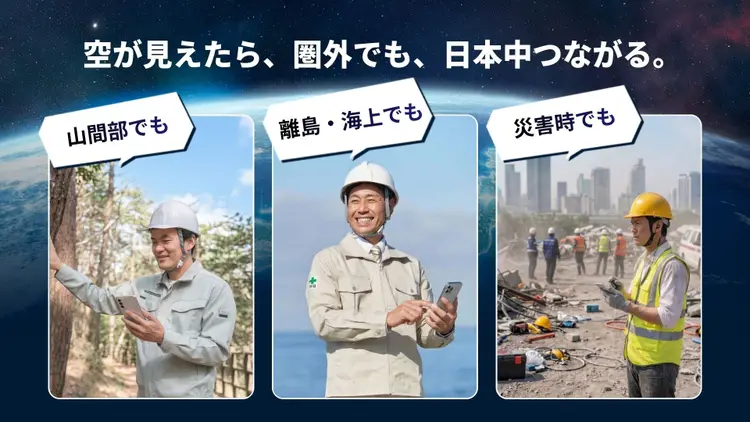 ご使用のスマホが「Starlink」と直接つながることで、圏外のエリアでも通信ができるサービスです。これまで電波が届かなかった山間部や海上でのコミュニケーションに加え、災害時の連絡にも屋外でご利用いただけます。
