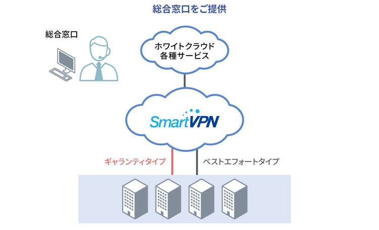 SmartVPNは、お客さまにてWebから帯域設定や変更などを実施することができます。また、これまでVPNサービスごとに分かれていた導入後の保守運用に関するお問い合わせなども一元化することで、何度も窓口ごとにお問い合わせをするわずらわしさを軽減いたします。