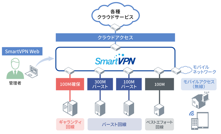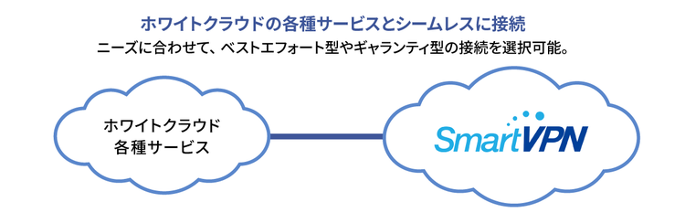 「ホワイトクラウド」の各種サービスとのシームレスな接続やモバイル端末からのリモートアクセス、信頼性の高いギャランティ型アクセスなど、マルチデバイス・マルチアクセスなサービスを取り揃えています。