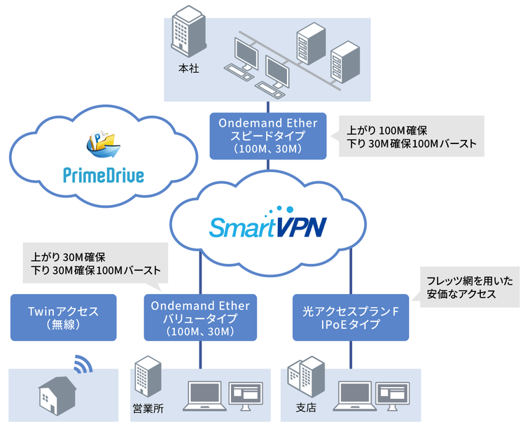 自由度の高いレイヤ2プランだけでなく、IPルーティングによる機能性が高いレイヤ3プランにも対応し、プラン間の料金や帯域を意識することなく、お客さまのニーズに応じて柔軟な構成が可能です。また、各種ホワイトクラウドサービスとシームレスな接続※が可能でき、その中でも「ビジュアモールスマートカタログ」、「インターネットVPNアクセス」、「PrimeDrive」は一部無料でご提供いたします。SmartVPNは、経済的で利便性も高いネットワークとして利用することができます。