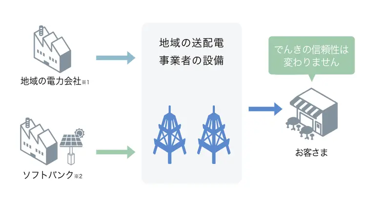 北海道電力、東北電力、東京電力エナジーパートナー、中部電力ミライズ、関西電力、中国電力、四国電力、九州電力、沖縄電力を指します。電力の供給は、SBパワー株式会社、九州電力の子会社で、小売電気事業者である九電ネクスト、または東京電力エナジーパートナーが行います。(電力供給エリアによって異なります。)