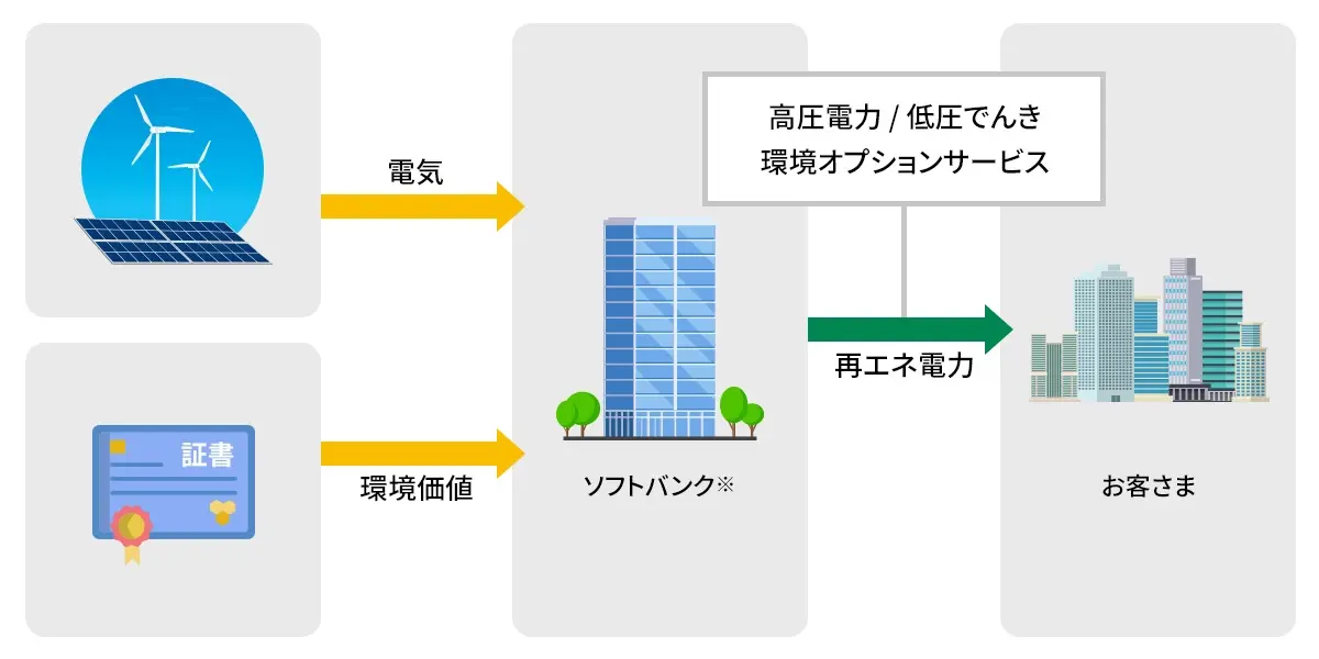 高圧電力環境オプションサービスは九電ネクスト㈱、または東京電力エナジーパートナー㈱からの電力供給、低圧電力環境オプションサービスはSBパワー㈱からの電力供給となります。