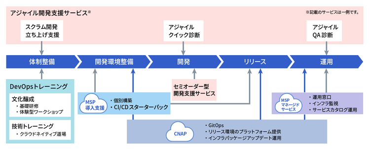 「アジャイル開発チームの立ち上げ支援」から、既存チームの課題を可視化する「アジャイルクイック診断」など、お客さまの課題や取り組みフェーズに合わせたサービスをラインナップ