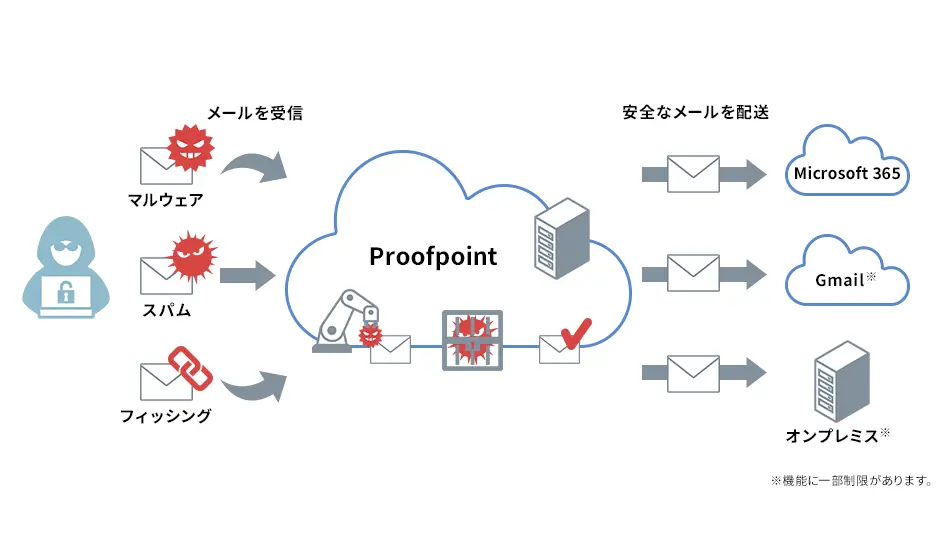 クラウドやオンプレミス※のメールサーバに危険なメールが配送される前に、お客さまの設定したポリシーに合わせてブロックします。