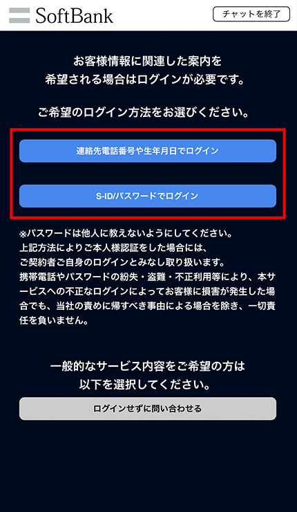 ログイン状態が切れている場合、ご本人さま確認が必要です