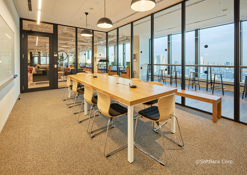 社内のオープンな雰囲気と社員同士の活発なコミュニケーションを喚起するガラス張りの会議室です。