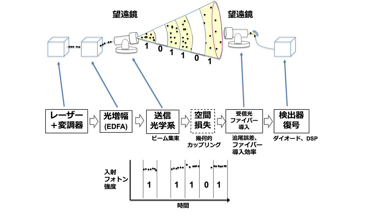 例えばごくおおまかに1.55μm帯、1Wのレーザーで1,000㎞先に向け送信し、そのビームの広がりを直径100m程度とした場合、この面積にフォトンが広がって届きます。受信側の望遠鏡を10㎝、10Gbit/sの通信速度とすると、幾何学的なカップリング、時間あたりに到達するフォトン数から、1ビットあたり数100個のフォトンが届けば「1」と判定できます。符号化と復号の観点からBER(Bit Error Rate、ビットエラー率)を10^-6に抑えるため、必要なフォトンを数十個とすれば、この光パワーから回線の成立が見込めます。光通信の成立性は無線通信における電界強度の計算にも似ていますが、実際には光学各部の損失や背景光雑音などさまざまな原因があり、十分なマージンをもって設計します。