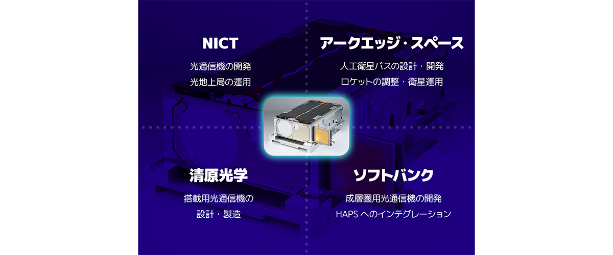 国立研究開発法人情報通信研究機構(NICT)、清原光学、アークエッジ・スペースおよびソフトバンクの4者は、宇宙と成層圏間および宇宙と地上間の光無線通信の実証に向けた取り組みを進めています。この実証で活用する小型衛星用の光無線通信装置については開発中ですが、NICTにおいて長年培われた光通信技術を社会実装する大きなステップとなっており、清原光学による光学部やモデム製造技術、アークエッジ・スペースによる衛星への実装技術を結集し、6Uサイズの衛星としては実装密度の高い衛星を短期間に実現しています。この衛星は、光通信の機能実証を行うことに特化しており、高性能カメラの映像を光で送るなどのデータ伝送機能は搭載されませんが、特定のビットパターンを送ってデータレートを確認する、地上からの光データを衛星で受信するなど、基礎的な光通信の機能確認を行うことは可能です。これは、打ち上げ機会に際して電波通信帯域の不足する今後の小型衛星にとっても価値のあるブレークスルーになるでしょう。