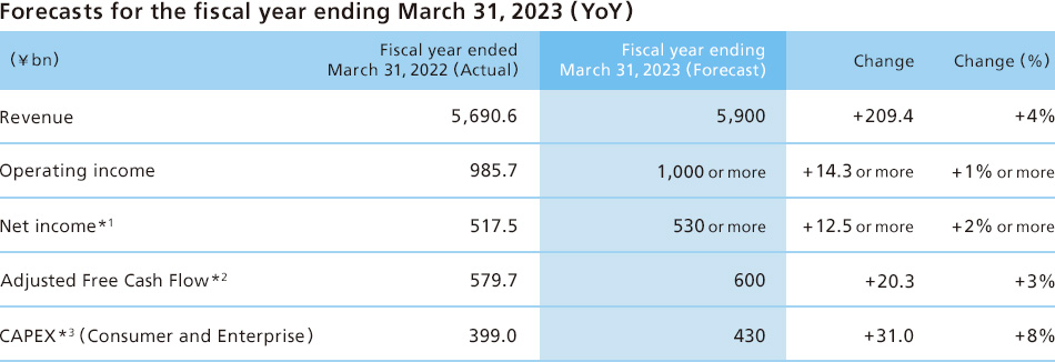 In the fiscal year ending March 31, 2023, we are committed to achieving our long-promised goal of ¥1 trillion in operating income (announced in August 2020). For the fiscal year ending March 31, 2023, the Consumer segment is expected to see a ¥159.5 billion (25%) year-on-year decrease in profit due to the impact of the mobile service price reduction. The Enterprise segment, in contrast, is expected to increase its profit by ¥21.5 billion (17%) from the previous fiscal year as its solutions and other businesses grow against the backdrop of the advancement of digitalization. We expect year-on-year growth for revenue and profits on a consolidated basis, taking into account the remeasurement gain from the consolidation of PayPay, which has grown significantly due to a Group-wide effort. Recording a remeasurement gain from making PayPay a subsidiary was fortunate in terms of timing, but we do not intend to use this to gloss over our business performance; rather, we aim to increase corporate value on a consolidated basis by generating cash flow that exceeds the previous year, not paper results. I see this situation as an important period preliminary to demonstrating our next stage of growth. I take the positive view that this will be a step toward our next growth, as we can win the confidence of the stakeholders in our management's commitment by maintaining revenue and profit growth by making PayPay a subsidiary even in the difficult time of the mobile service price reduction.