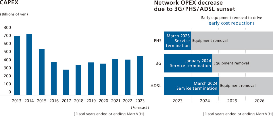We expect the cost reduction to become more pronounced from the fiscal year ending March 31, 2024 onwards. First, with regard to fixed costs, the depreciation of large capital expenditures at the ¥700 billion level that were made after 2012, when the company acquired the wide-coverage frequency band (what we call the “Platinum Band”), has come to an end, which means depreciation and amortization expenses are entering a contraction phase. Furthermore, PHS, 3G, and ADSL services will be phased out one by one, and the associated equipment will be decommissioned promptly. By consolidating our networks into 4G/5G and optical lines in this way, we expect to reduce their operating costs by approximately ¥20 billion in total. The negative impact of the mobile service price reduction in the fiscal year ending March 31, 2024 will be largely offset by the decrease of depreciation and operational costs, and we intend to return to an earnings growth trend with business growth in the Enterprise and the Yahoo! JAPAN/LINE segments.