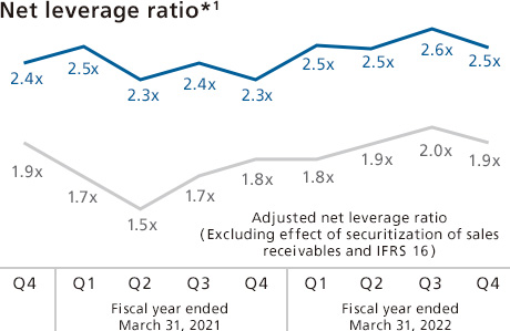 We currently have long-term issuer ratings of A+ and AA− with Rating and Investment Information, Inc. (R&I) and Japan Credit Rating Agency, Ltd. (JCR), respectively. We will continue to maintain this high rating while preserving both our earnings capacity and financial soundness. In monitoring financial soundness, we emphasize net leverage ratio as an important indicator. This is the ratio of net interest-bearing debt to adjusted EBITDA.