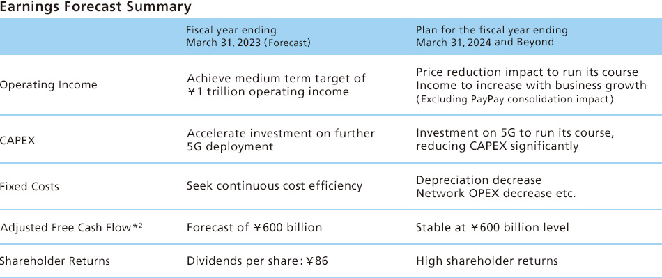 Starting from the fiscal year ending March 31, 2024, the impact of the mobile service price reduction will have run its course, and we will begin to see the impact of cost reduction efforts and decreasing depreciation costs, along with business growth in the Enterprise and the Yahoo! JAPAN/LINE segments. Therefore, operating income on a consolidated basis excluding the impact of PayPay becoming a subsidiary will bottom out in the fiscal year ending March 31, 2023, and then recover from the fiscal year ending March 31, 2024 onwards. In addition, we expect to be able to generate stable cash flow on an ongoing basis as the rollout of our 5G area investment runs its course and capital expenditures decline significantly.