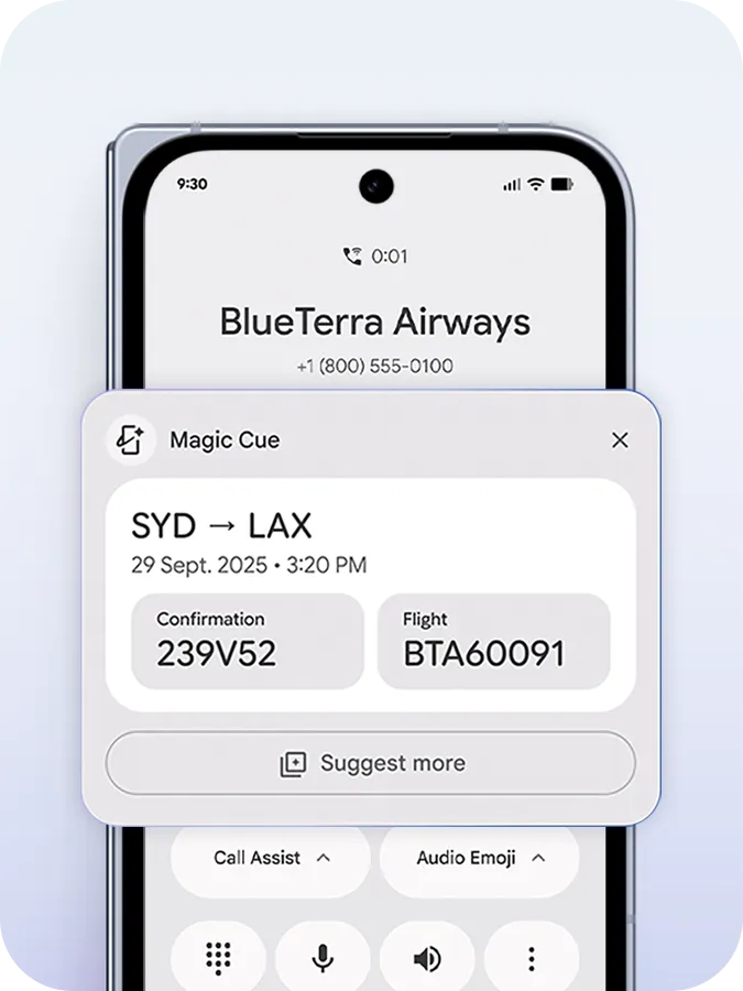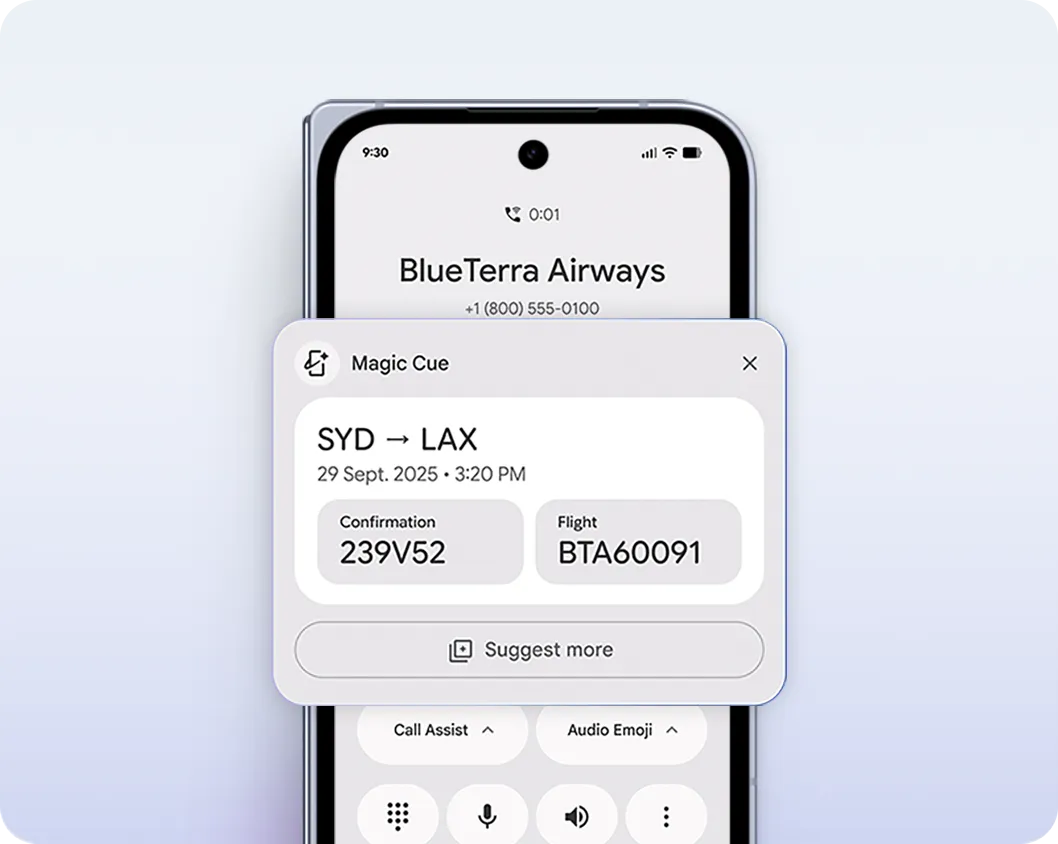 Magic Cue proactively suggests relevant info and actions. Calling your airline? It finds your flight info from your email.4