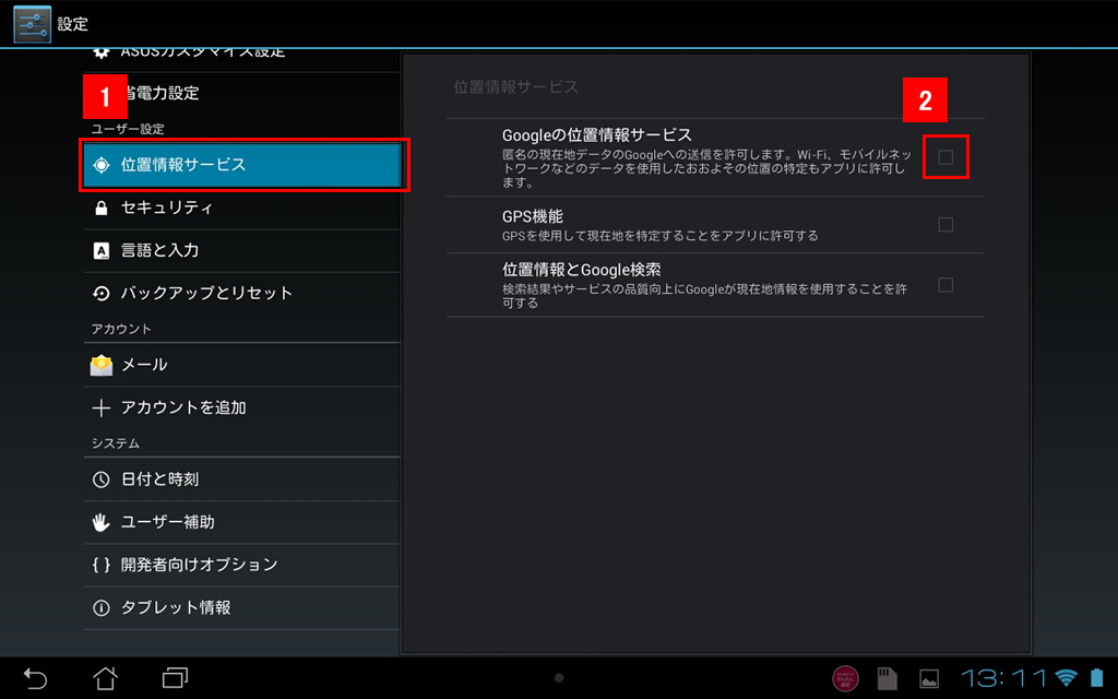 [位置情報サービス]をタップ、[Googleの位置情報サービス]にチェックが入っていることを確認します。