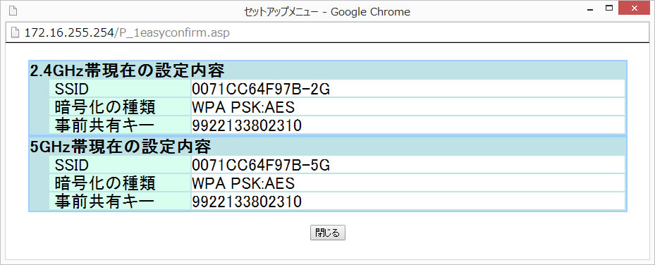 初期値で接続できない場合、「SSID」、「PSK-AES」の値を変更していることが考えられます。その場合は、以下手順に沿ってご確認ください。