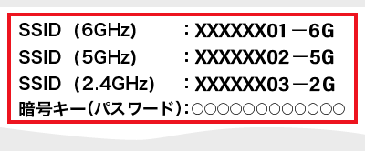 (詳しくは各種機種の説明書をご確認、またはメーカーにお問い合わせください。) - Airターミナル6は、Wi-Fi周波数帯2.4GHz、5GHz、6GHzを共通のSSIDと暗号キー(パスワード)で利用できます。SSIDは、「XXXXXX02-5G」1つだけが表示されます。(「XXXXXX」は英数字です)