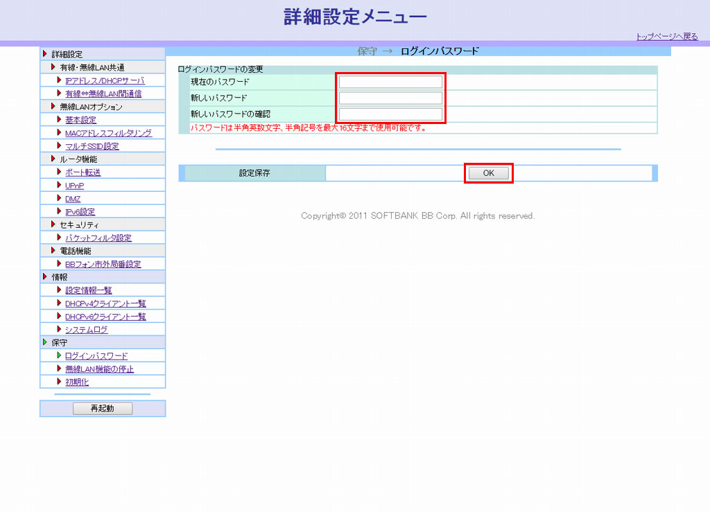 「現在のパスワード」、「新しいパスワード」、「新しいパスワードの確認」を入力し、[OK]をクリックします。