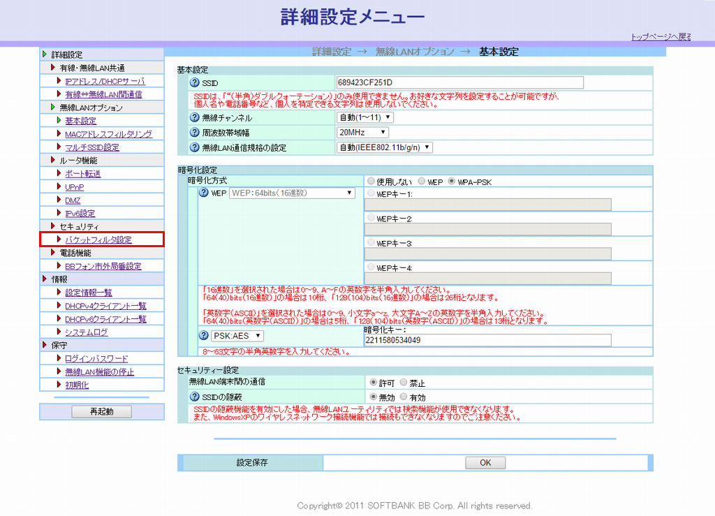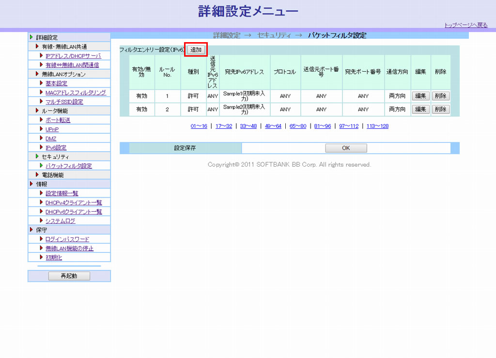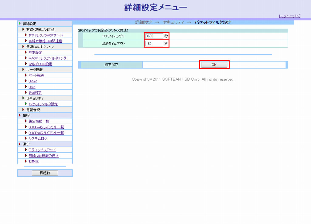 本項では、パケットフィルタに関する設定と、無通信時にSPI機能を維持する時間(SPIタイムアウト)の設定ができます。