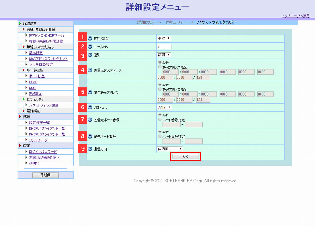 フィルタリング条件として、通信方向を指定します。インターネット(WAN)から光BBユニットに接続している機器(LAN)への通信をフィルタリング対象とする場合は「WAN→LAN」、その逆であれば「LAN→WAN」、両方向であれば「両方向」を選択します。