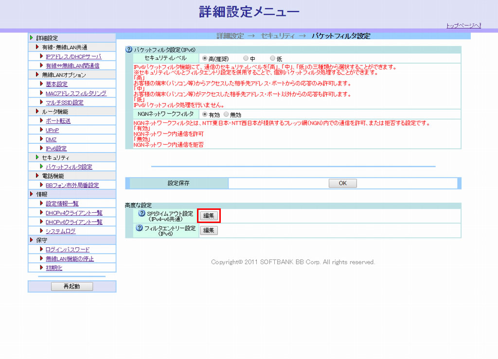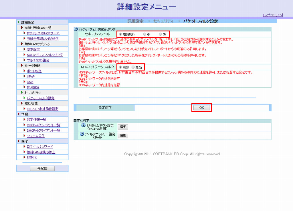 光BBユニットを透過するIPv6パケットの制御を高中低の3段階で設定できます。NGNネットワークフィルタ