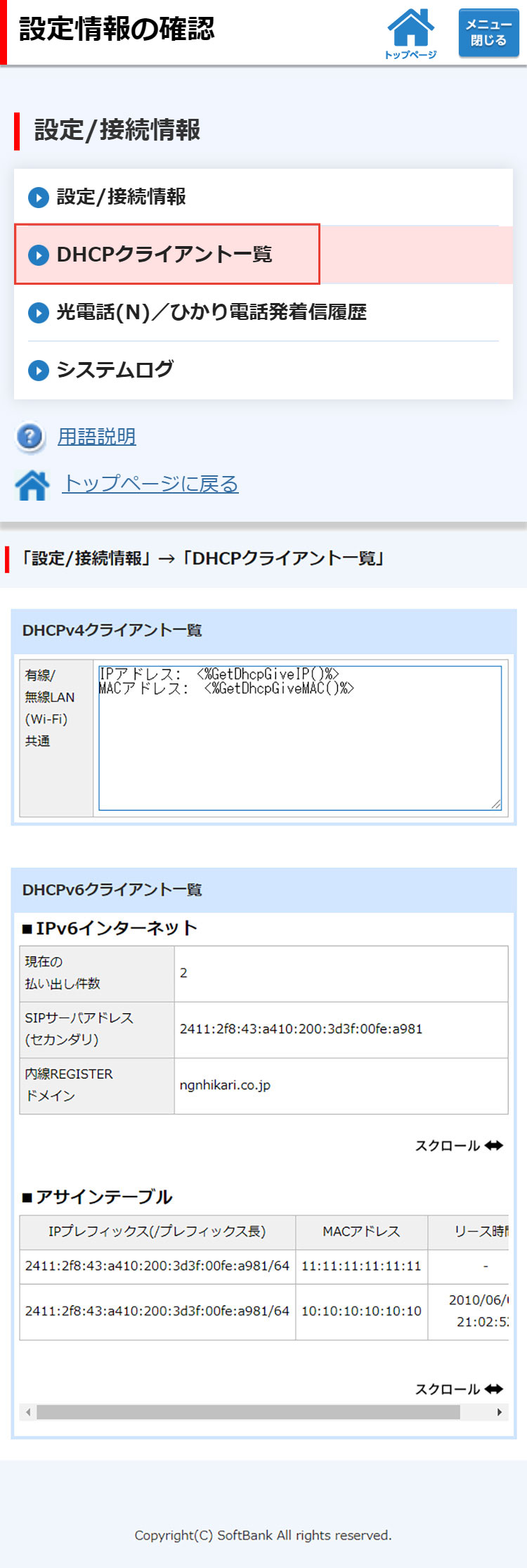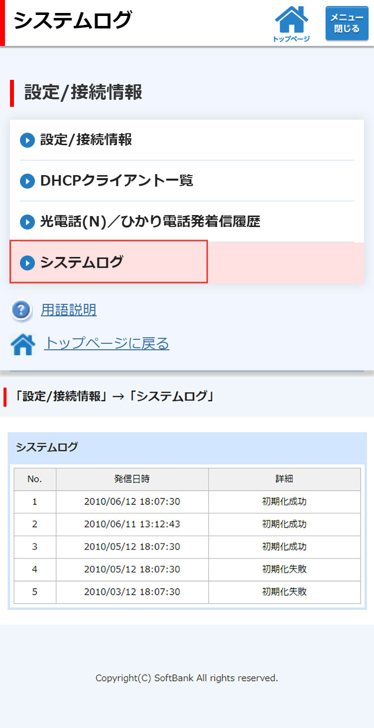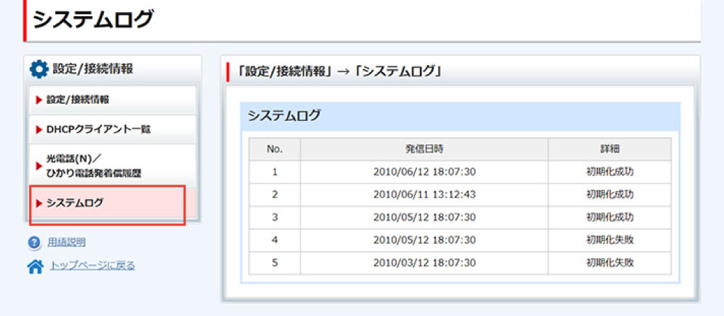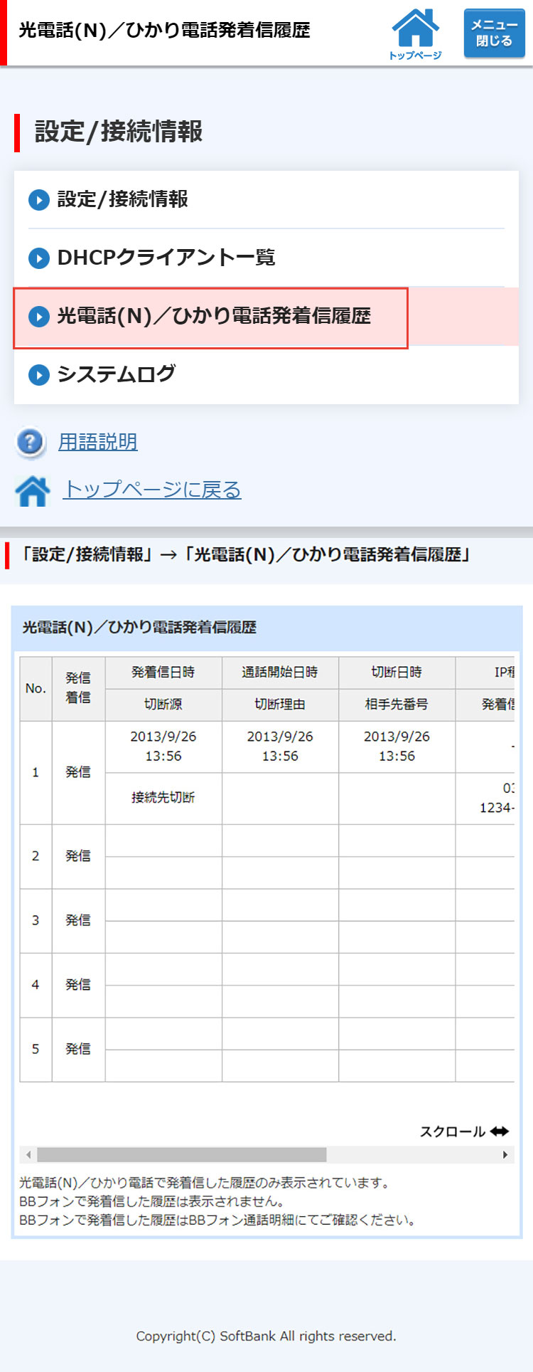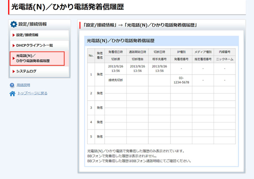 光BBユニットで使用したひかり電話発着信履歴の確認ができます。