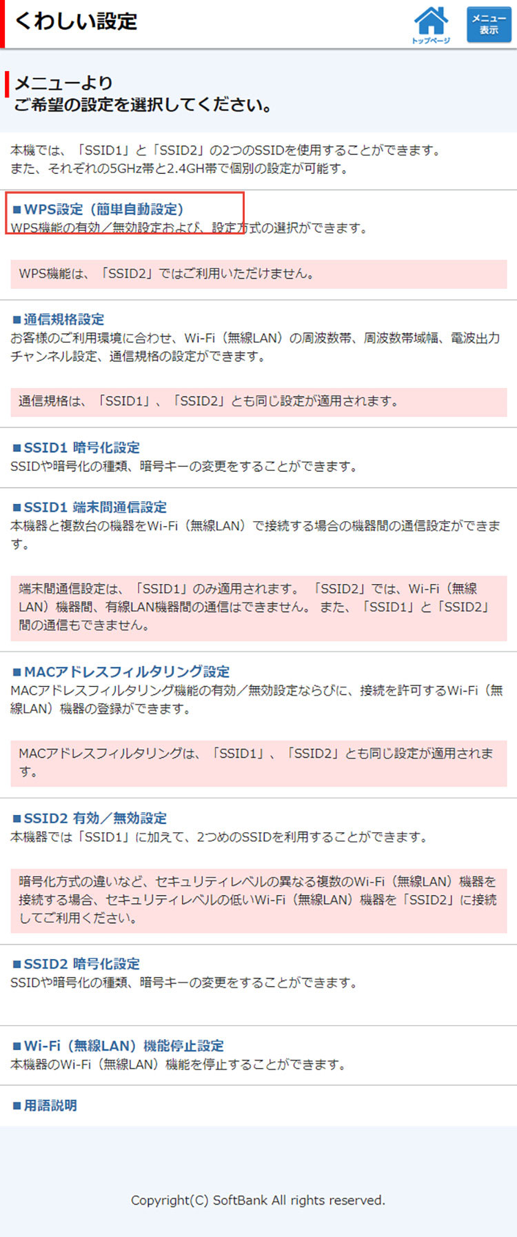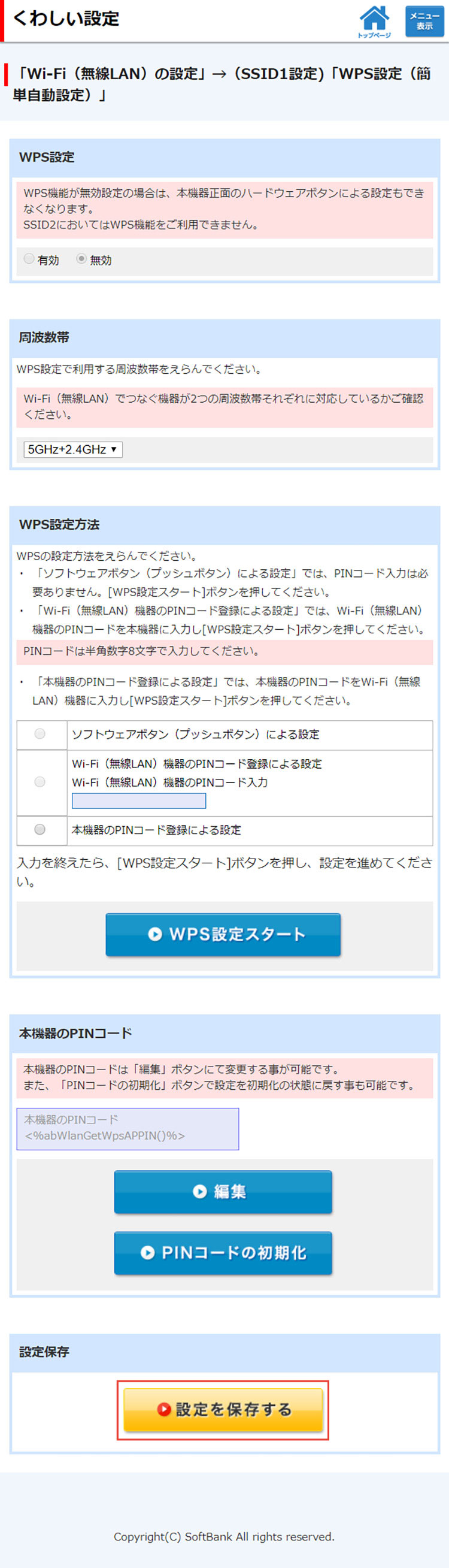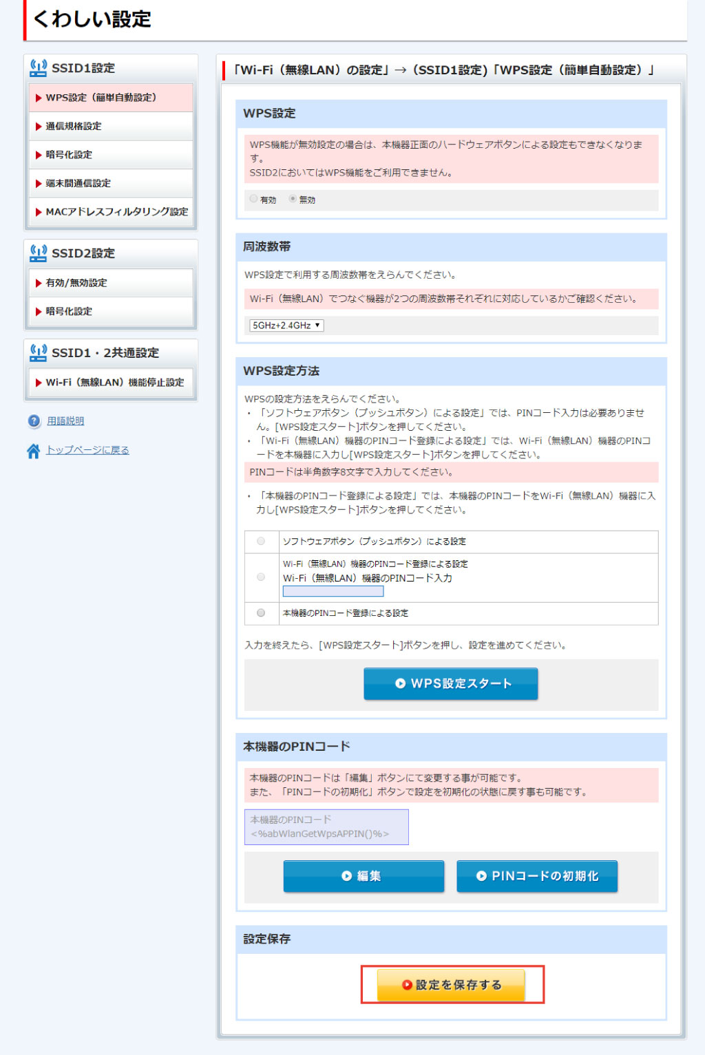 本項ではWPS機能の有効/無効設定および、設定方式の選択ができます。