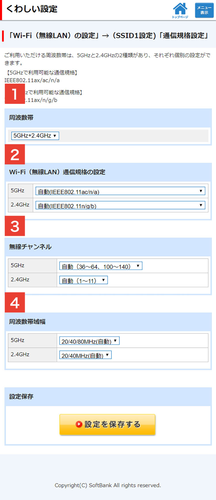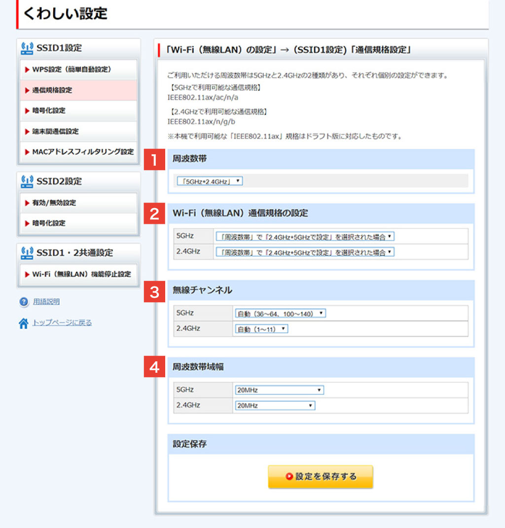 2.4GHzと5GHzそれぞれの無線チャンネル(周波数の幅)の設定ができます。 -