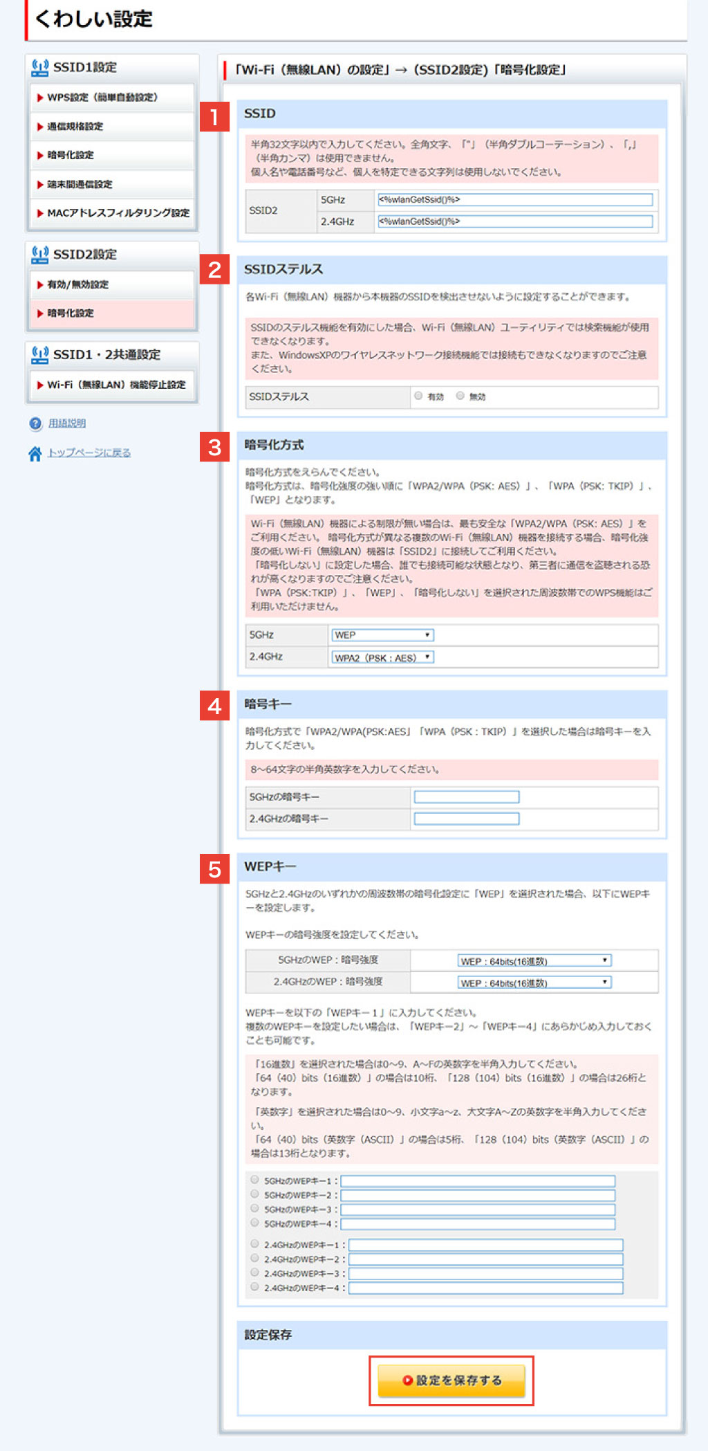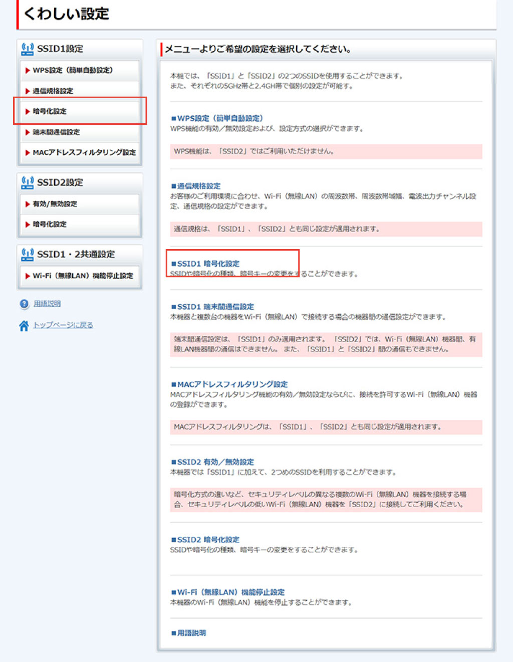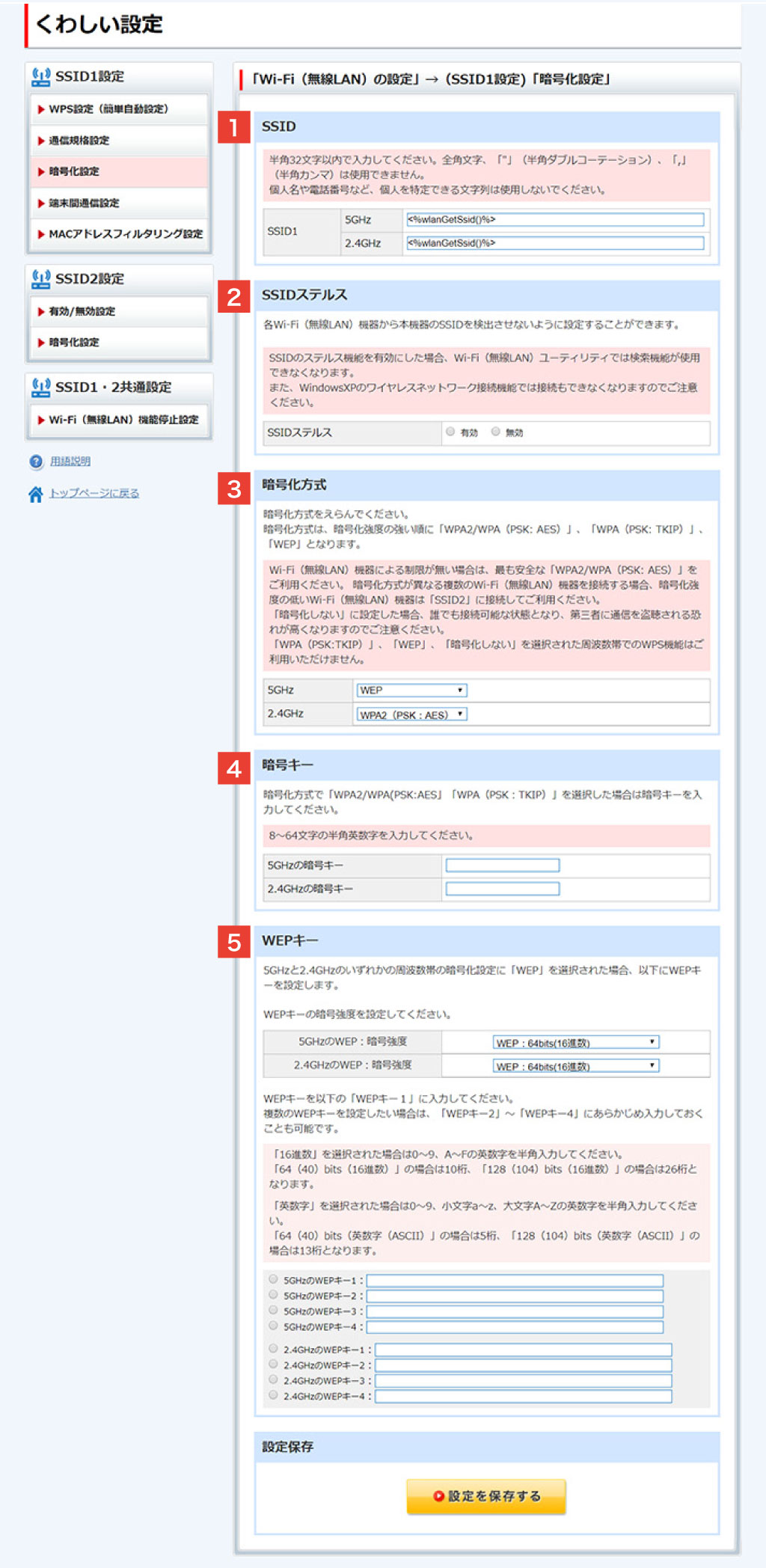 本項では、SSIDや暗号化の種類、暗号キーの変更をすることができます。