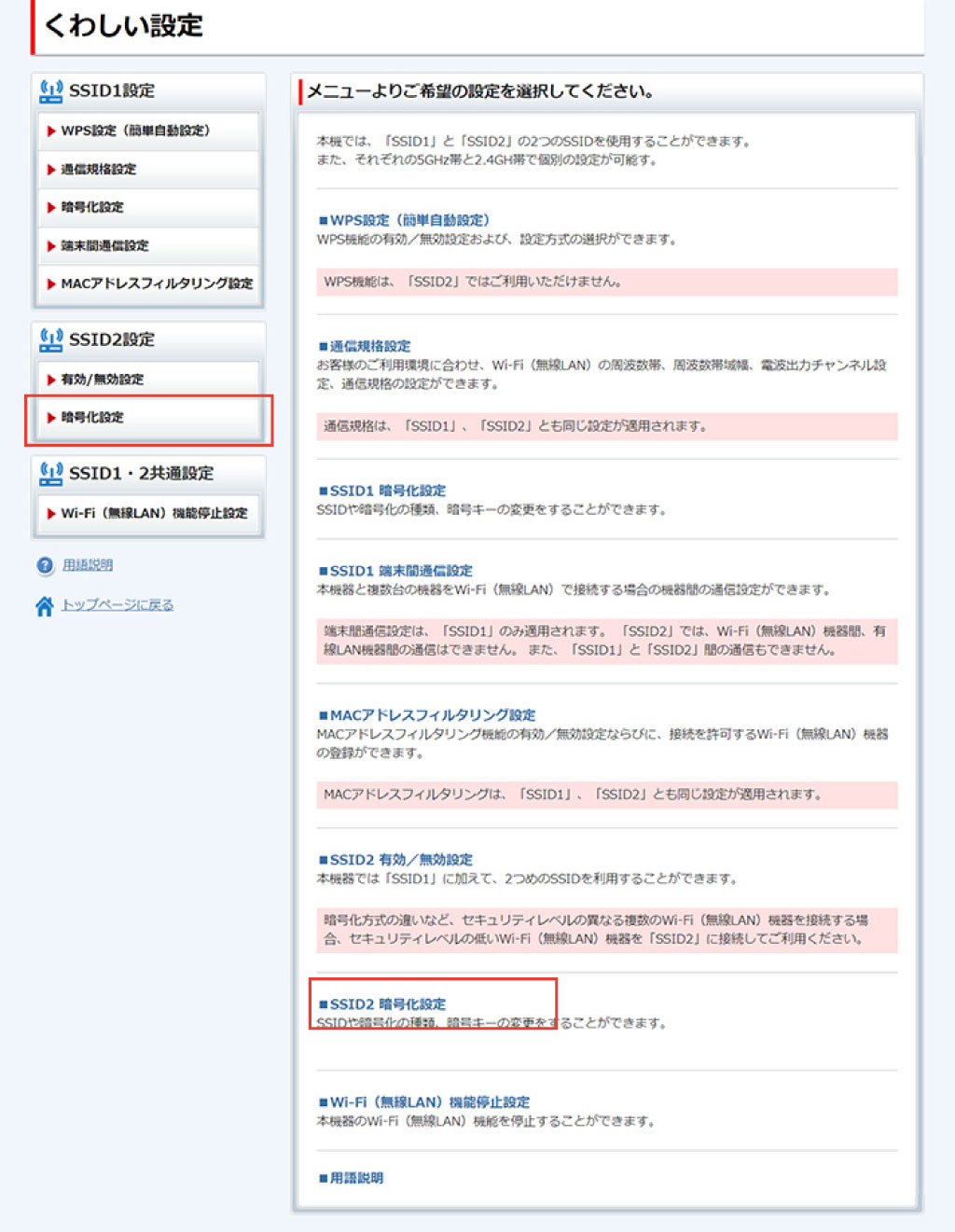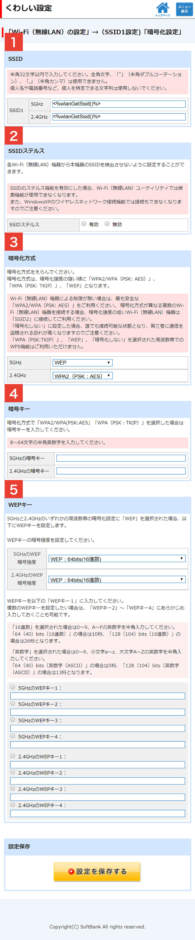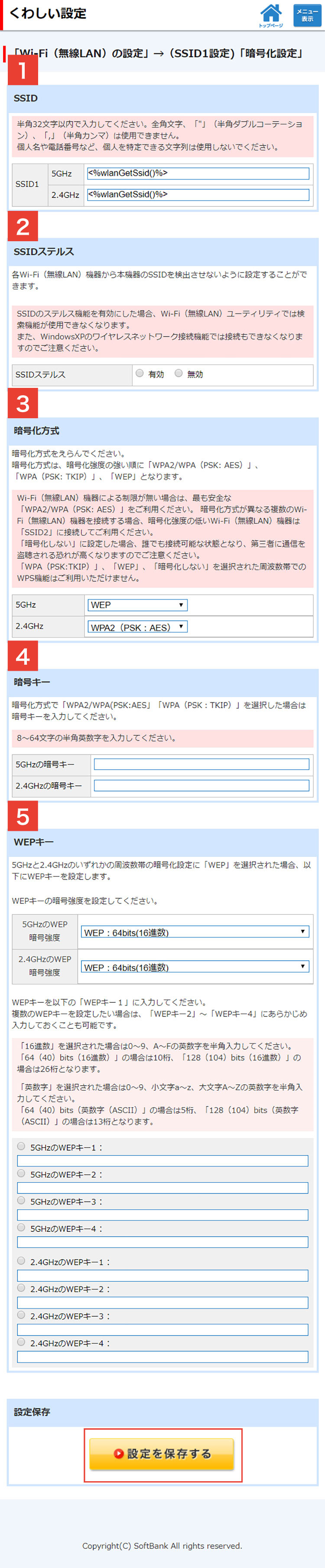 本項では、SSIDや暗号化の種類、暗号キーの変更をすることができます。
