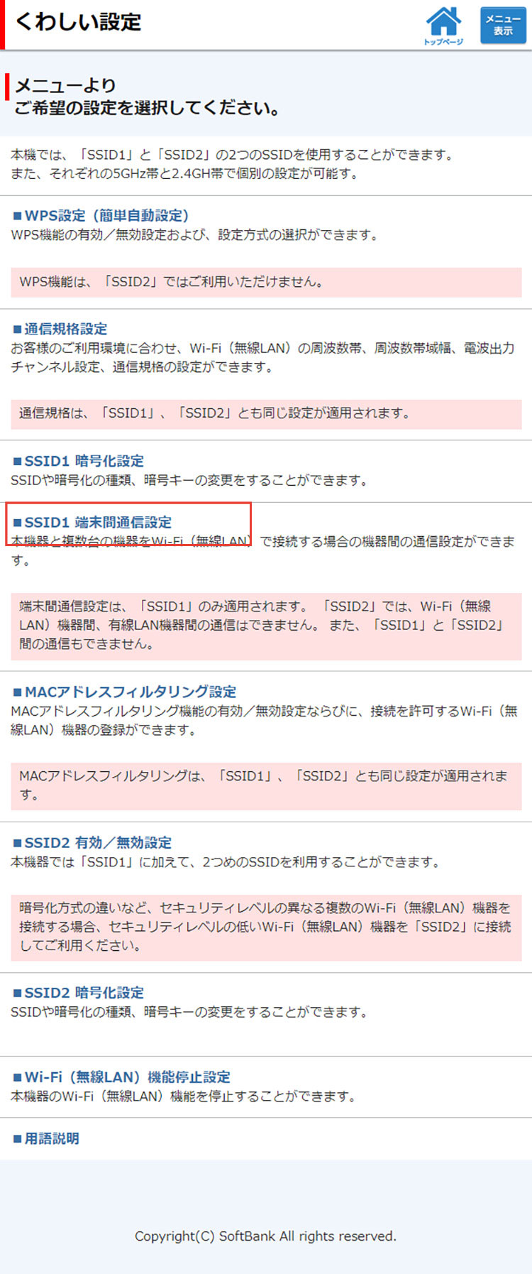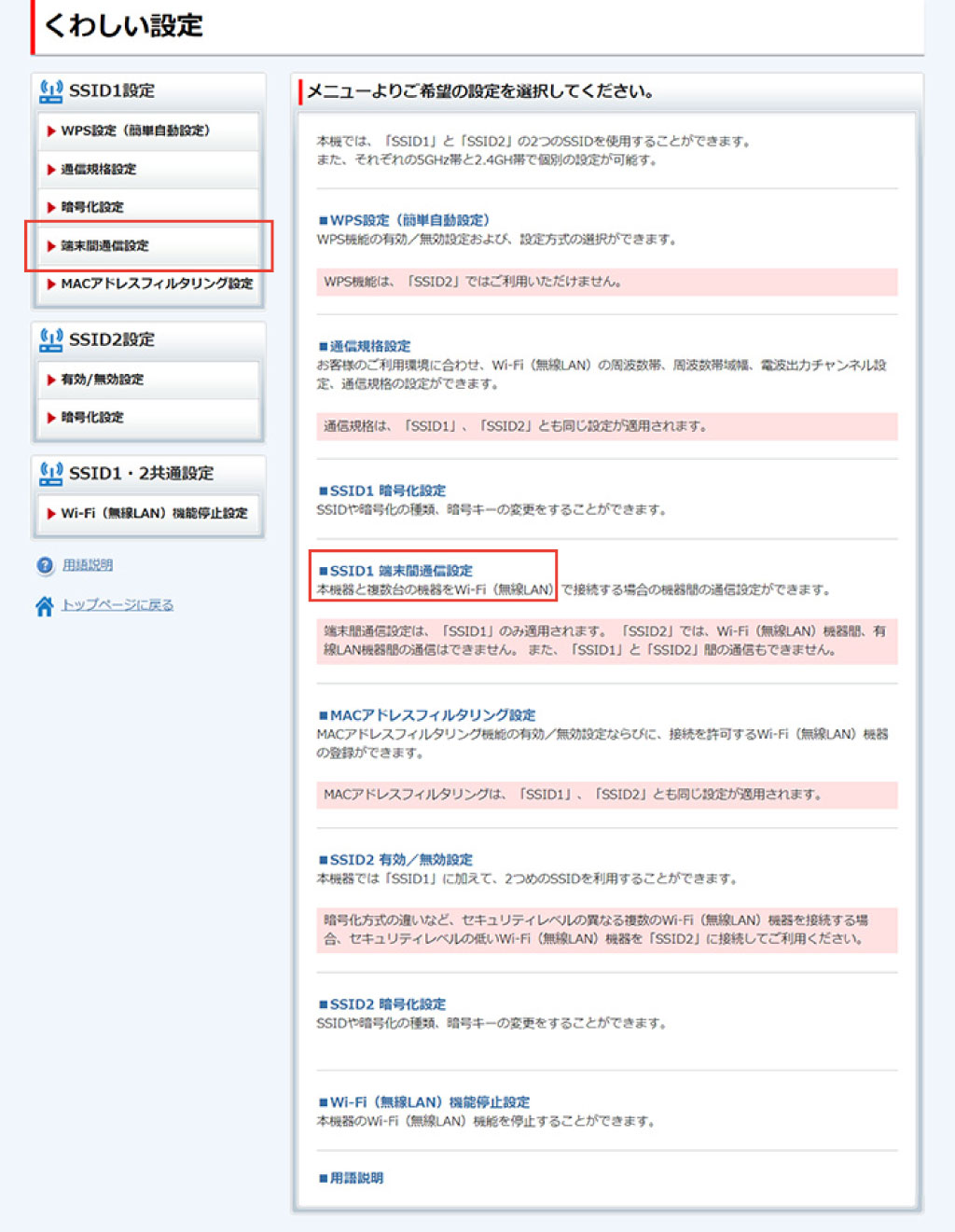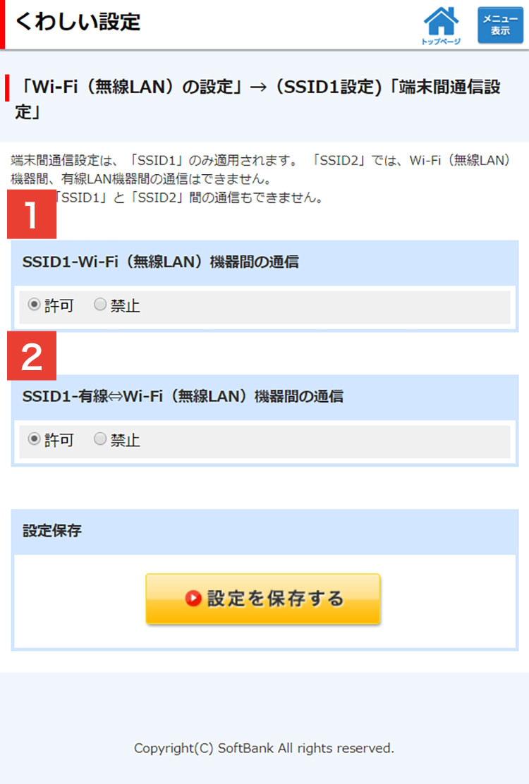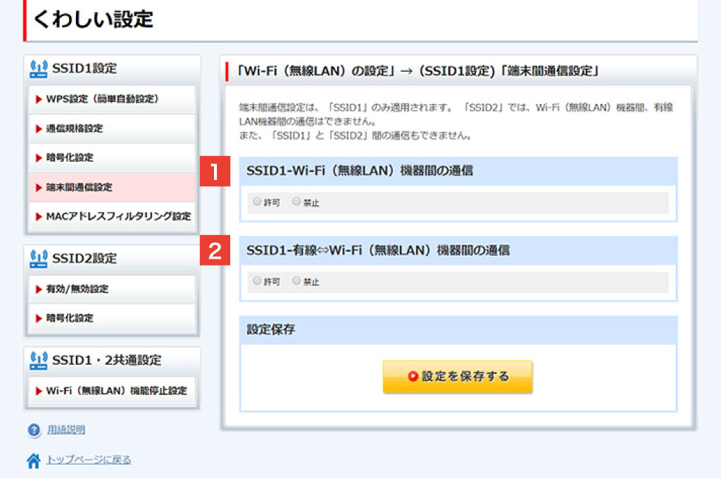 SSID1に接続している無線LAN機器同士の通信、または、有線LANで接続されている機器と、SSID1に接続している無線LAN機器間の通信を許可/禁止する設定ができます。