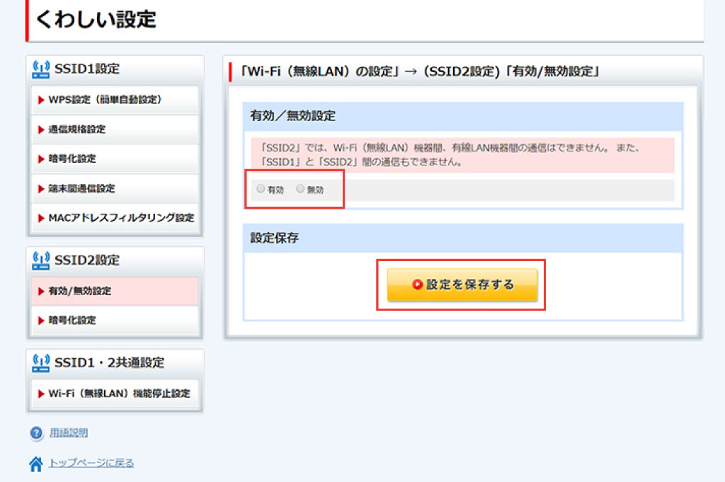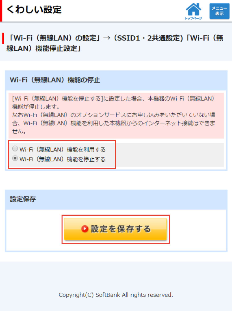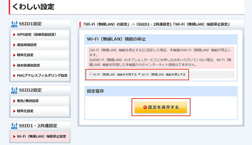 [Wi-Fi(無線LAN)機能を利用する][Wi-FI(無線LAN)機能を停止する]いずれかを選択し、[設定を保存する]をクリックします。