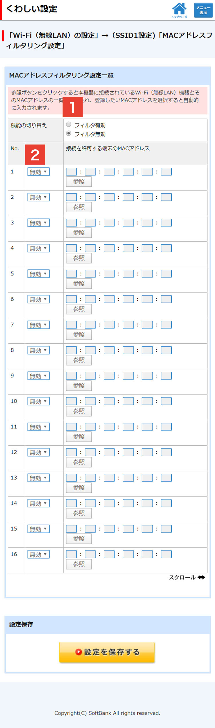 MACアドレスフィルタリングが有効な状態で、MACアドレスを1つも設定しない場合はすべての機器から無線LAN接続できなくなりますのでご注意ください。