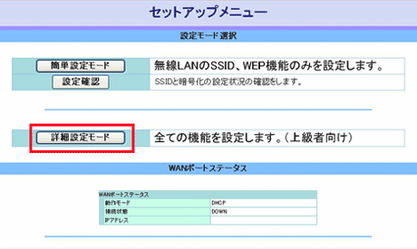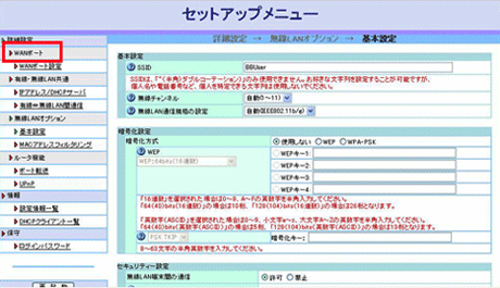 項目 入力内容 WANポート設定 動作モード [PPPoEクライアント]を選択してください。 PPPoEクライアント設定 PPPoEユーザー名 「Yahoo! BBご利用開始のご案内(スターターパック)」に記載されている、認証ID(PPPoEユーザ名)を「@」以降まで全て入力してください。 PPPoEパスワード 「Yahoo! BBご利用開始のご案内(スターターパック)」に記載されている認証パスワードを入力してください。 暗号化 [自動選択]を選択して下さい。 -