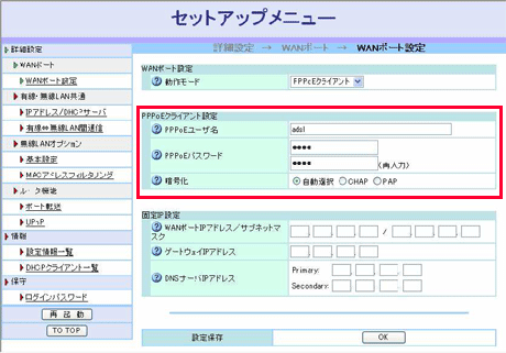 「WANポート設定」と「PPPoEクライアント設定」に設定を入力します。