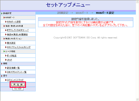 「WANポート設定」画面で[OK]ボタンをクリックすると以下の画面に変わりますので、画面左下の[再起動]ボタンをクリックします。