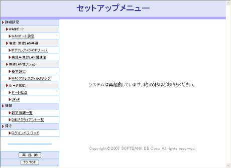 「システムは再起動しています。約100秒ほどお待ちください」と表示され、約100秒後に「セットアップメニュー」に戻ります。