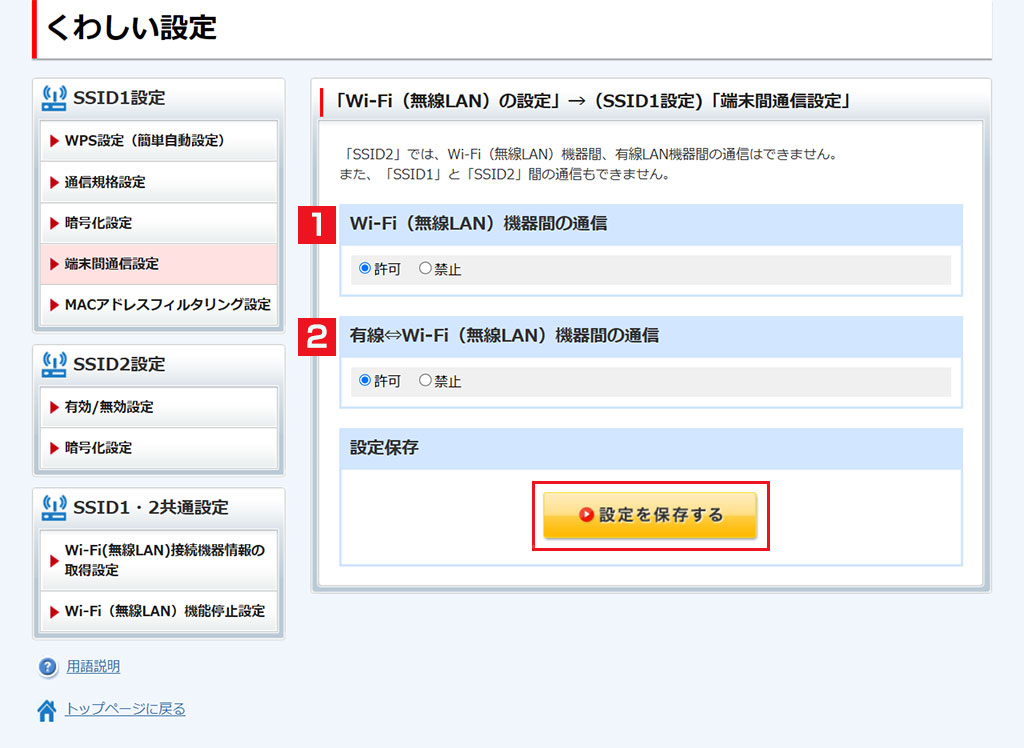 SSID1に接続しているWi-Fi(無線LAN)機器同士の通信、または、有線LANで接続されている機器と、SSID1に接続しているWi-Fi(無線LAN)機器間の通信を許可/禁止する設定ができます。