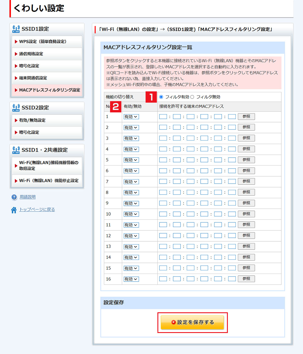 本項では、MACアドレスフィルタリング機能の設定ができます。