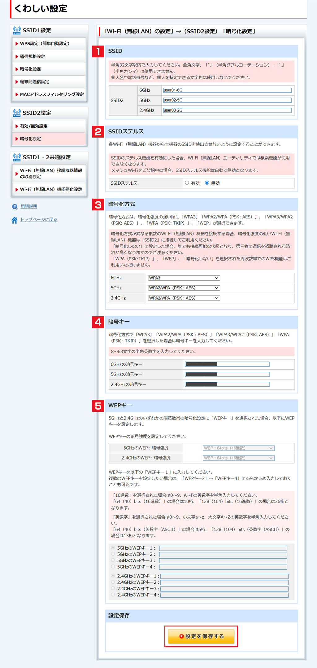2.4GHzと5GHzと6GHz、それぞれの暗号化方式の設定ができます。 -