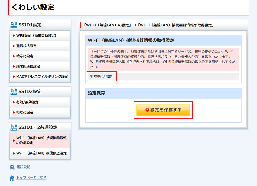 Wi-Fi(無線LAN)接続機器情報の取得設定の有効/無効設定ができます。