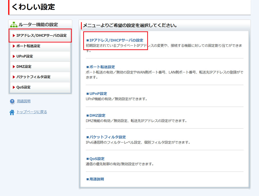 [IPアドレス/DHCPサーバの設定]をクリックします。