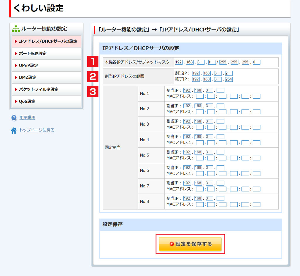 IPアドレスのDHCP固定割り当て設定ができます。